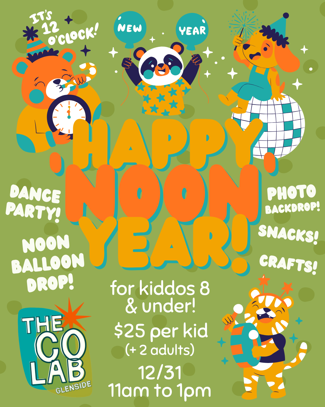 Hey parents with kiddos 8 and under - we’re hosting a very special Happy ‘Noon’ Year on 12/31 🥳 Come ring in the New Year with a 12-noon balloon drop, snacks & drinks, crafts, a dance party, and photo backdrop 🎉